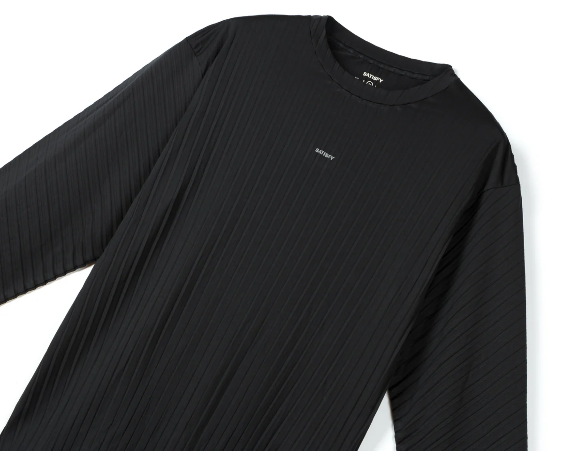 The AuraLite™ Muscle Tee is where recycled Japanese engineering meets Satisfy's off-duty attitude. A 4-way stretch micro-jersey — 100% recycled polyester — cut loose, silky against the skin, fast-drying on principle. The Pleated and Tech versions add mapped mesh panels under the arms and across the back where heat needs to leave. Worn for long efforts, tempo days, and any run where cotton is too much and a race singlet is too little. The AuraLite™ Pleated Long Tee is the long-sleeve take on the pleated recycled-polyester knit — shoulder-season technical top with visible texture.