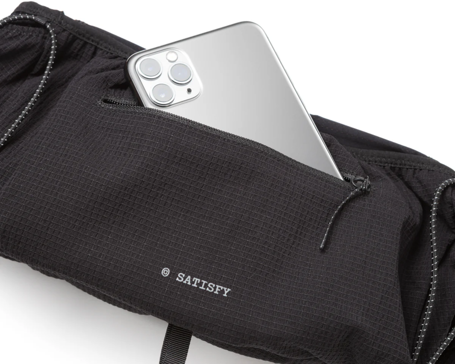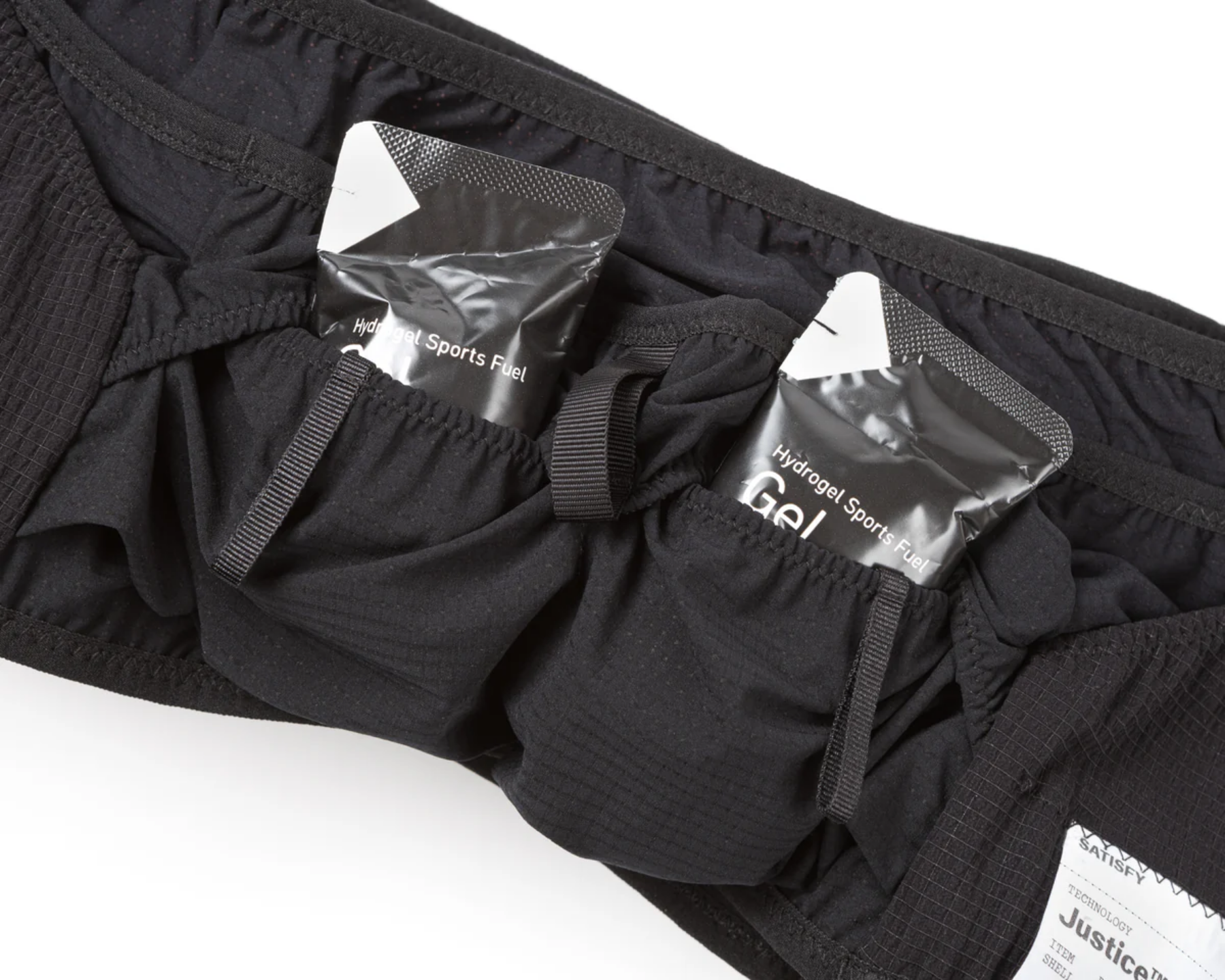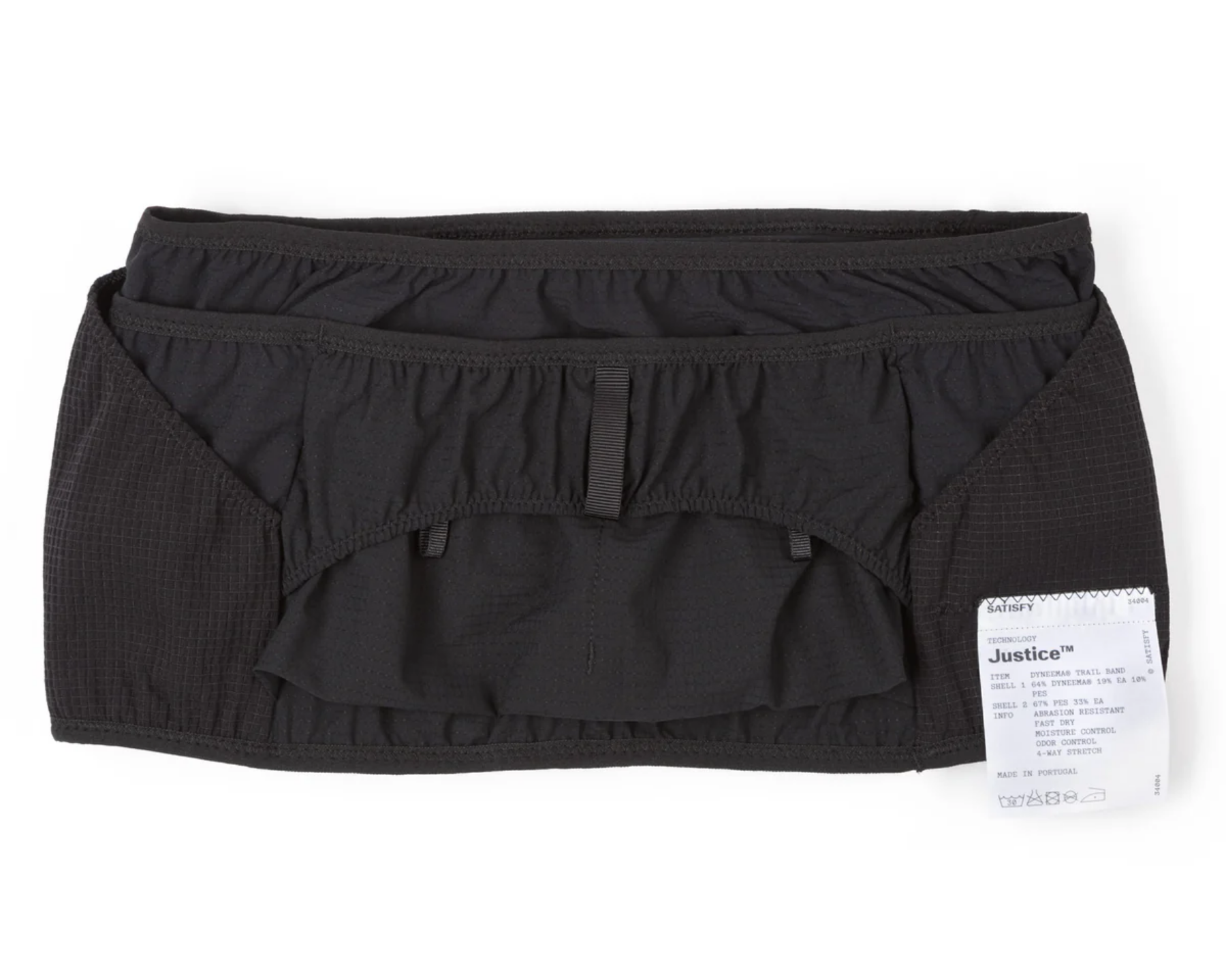 The Justice™ Cordura® 5L Hydration Vest is Satisfy's trail-carry platform — 137g with two 500ml HydraPak® flasks, an 8-pocket mapped system, Cordura® reinforcement where poles and packs meet fabric. The Justice™ Dyneema® Trail Band runs 75g — 9 pockets, zippered security pocket, Dyneema® at the friction zones. Built for runners whose High includes 8 hours on a ridgeline. The Justice™ Dyneema® Trail Band runs 75g — 9 pockets, zippered security pocket, Dyneema® reinforcement at the friction points — for runners who want vest-level carry without a vest.