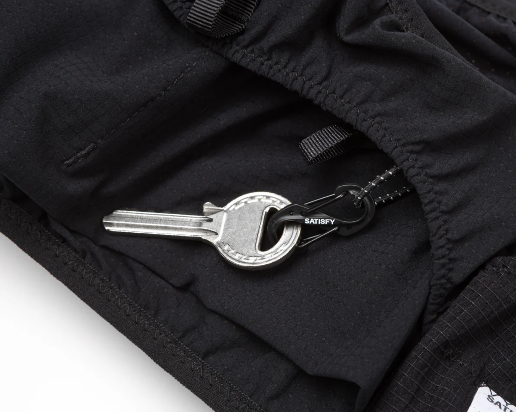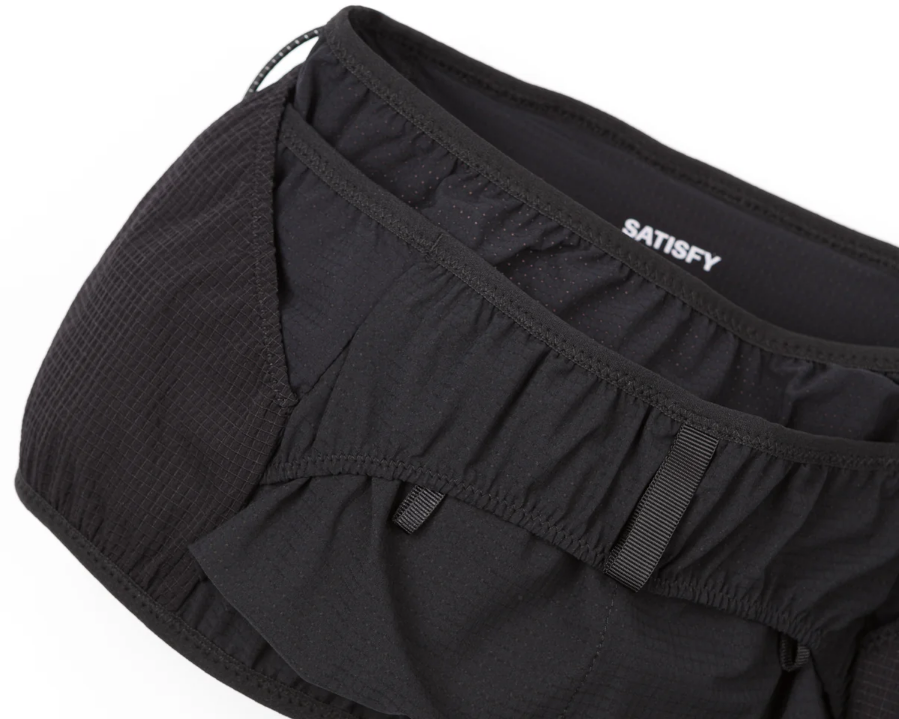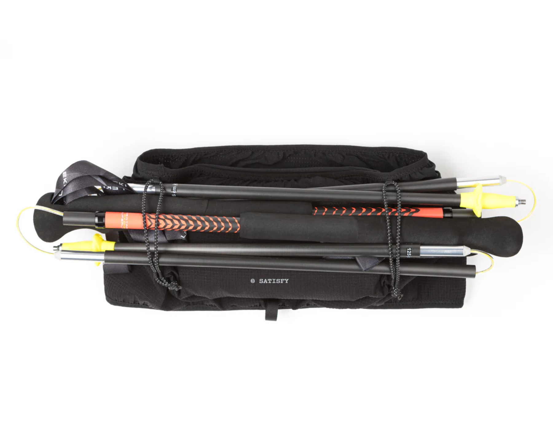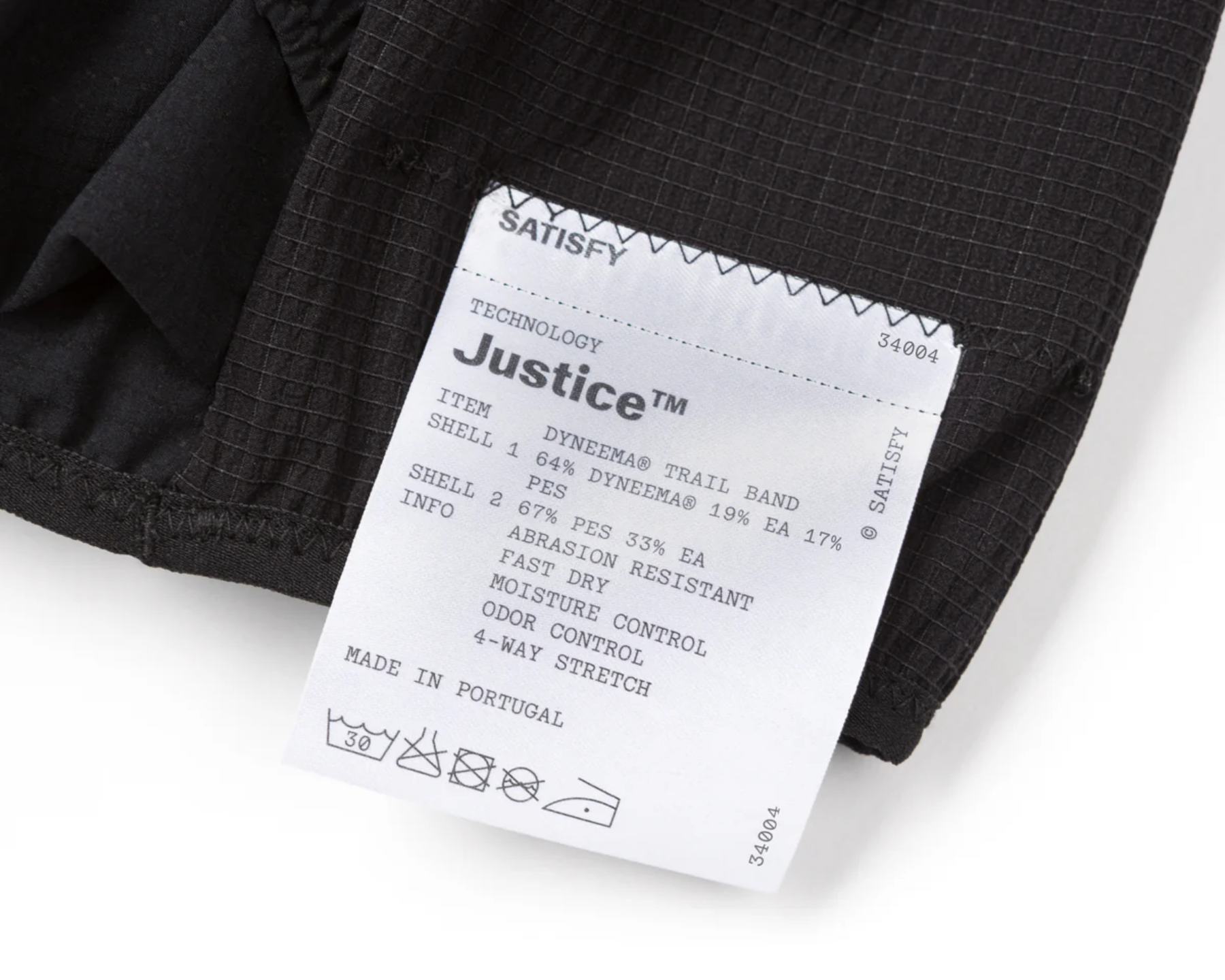 The Justice™ Cordura® 5L Hydration Vest is Satisfy's trail-carry platform — 137g with two 500ml HydraPak® flasks, an 8-pocket mapped system, Cordura® reinforcement where poles and packs meet fabric. The Justice™ Dyneema® Trail Band runs 75g — 9 pockets, zippered security pocket, Dyneema® at the friction zones. Built for runners whose High includes 8 hours on a ridgeline. The Justice™ Dyneema® Trail Band runs 75g — 9 pockets, zippered security pocket, Dyneema® reinforcement at the friction points — for runners who want vest-level carry without a vest.
