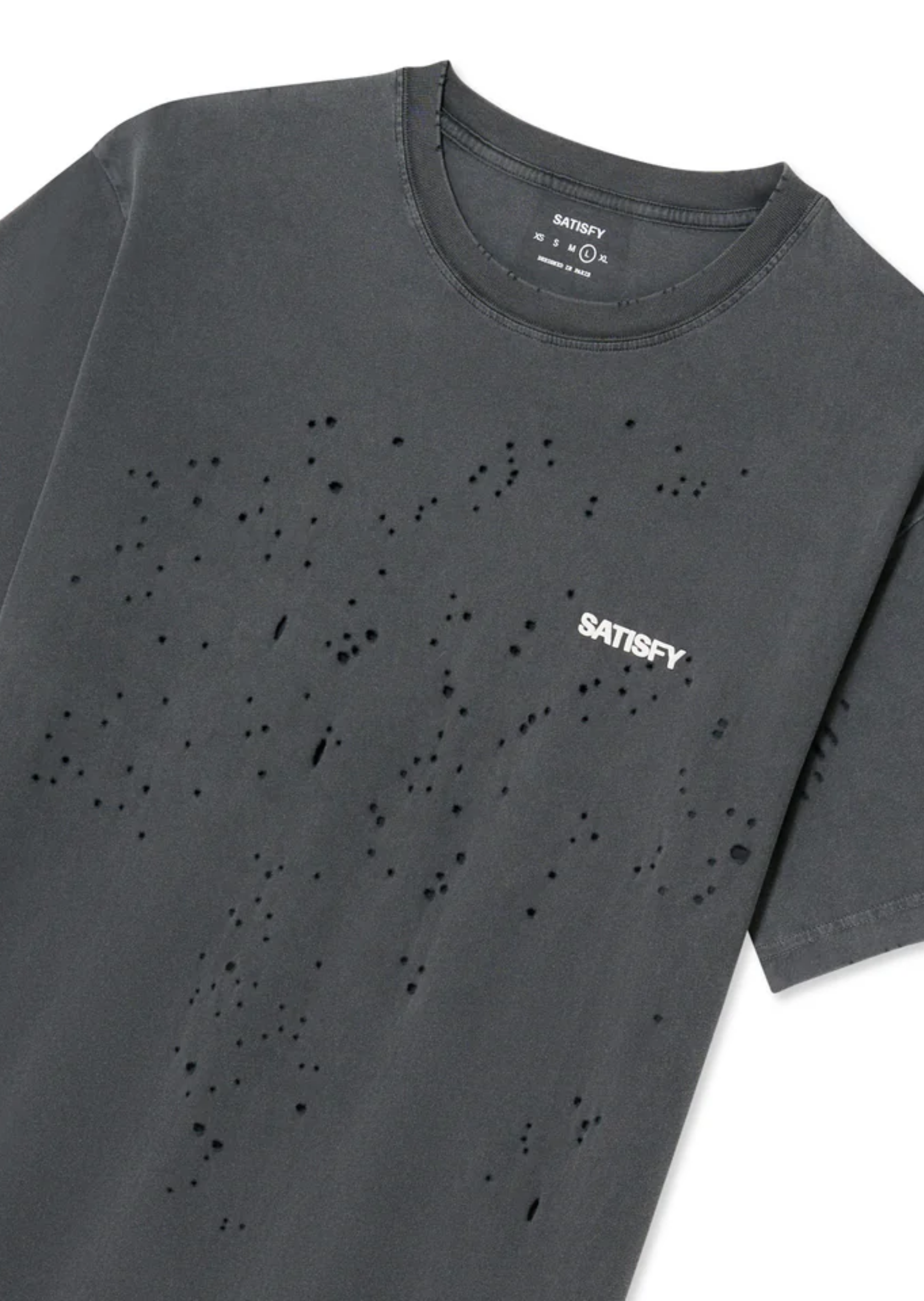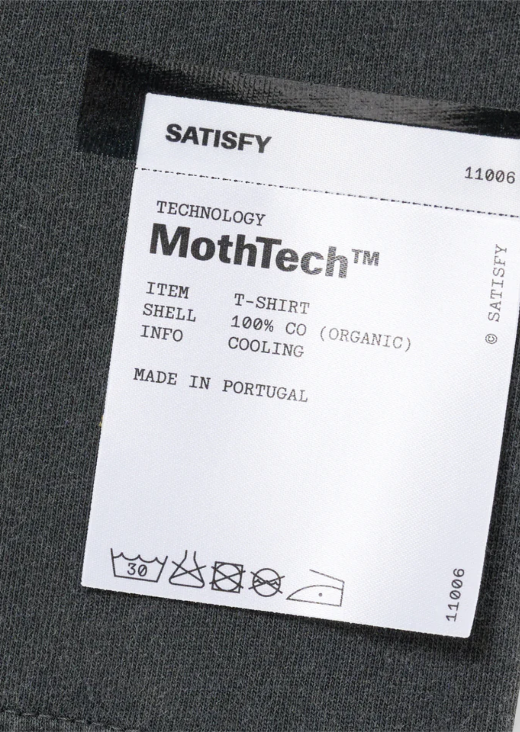 The MothTech™ T-Shirt is the Satisfy archetype — 175 grams of organic Portuguese cotton with body-mapped moth holes laser-cut over the hottest heat zones. It's the shirt that lets Satisfy say 'it's OK to run in cotton' and mean it. Worn from midnight track intervals through the next morning's espresso, it carries aged dye treatments, wave logos, and a loose, lived-in drape that reads more flea-market find than tech jersey. This is the Runner's High in T-shirt form. This MothTech™ T-Shirt runs aged-and-faded Wave Logo treatments — flea-market-find cotton that happens to breathe through body-mapped moth holes.
