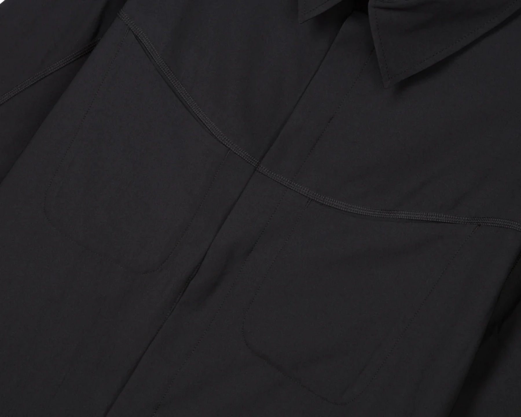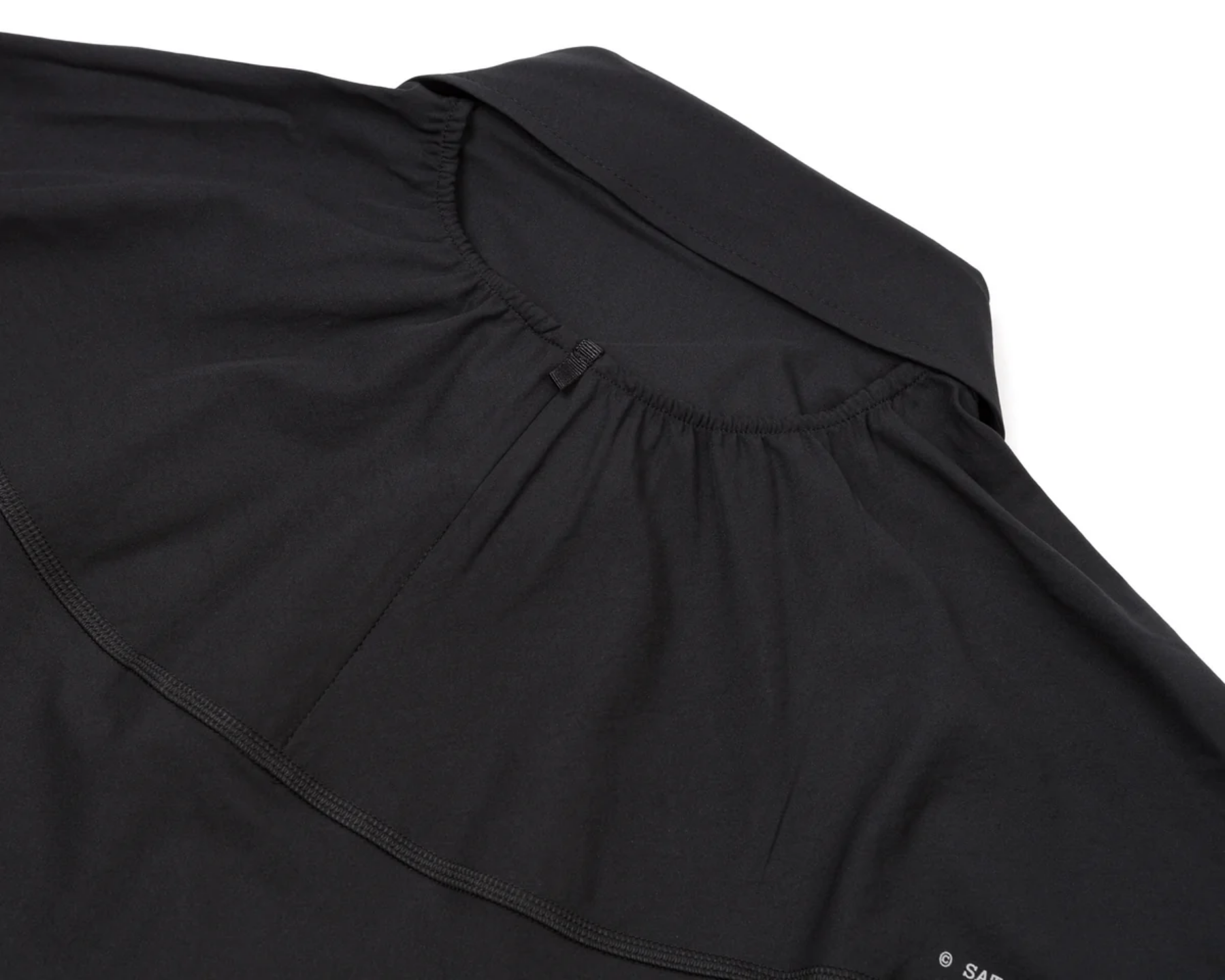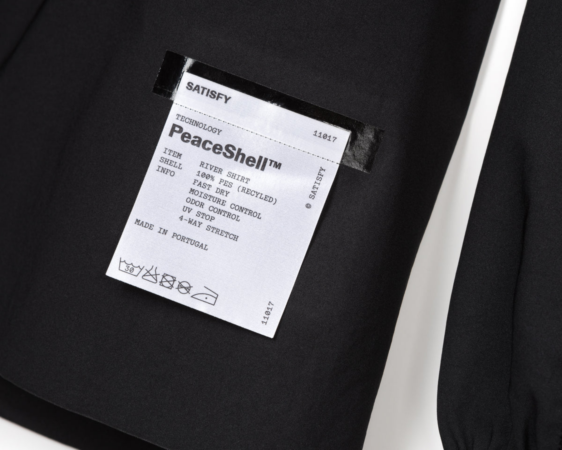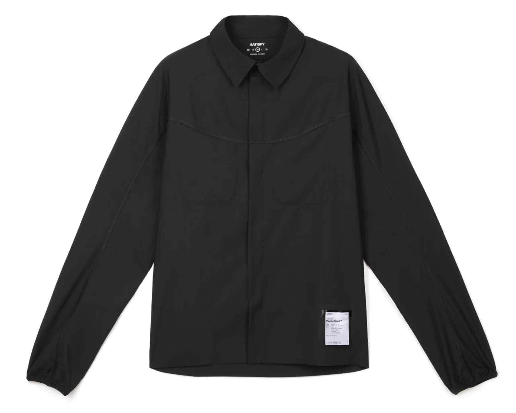 PeaceShell™ is the fabric Satisfy reaches for when wind and water are coming but a full shell is overkill. A 4-way-stretch recycled micro-twill from Japan (or a 2-way woven from France), DWR finish repelling water and dirt, fast-drying on principle. The River Shirt packs ice in its back pockets for mid-race cooling. The Unlined 5" Shorts run clean against skin. The caps are 28g and designed to disappear on your head over long efforts. The PeaceShell™ River Shirt packs ice in its back pockets for mid-race cooling — 168g shirt in M with a soft-shell recycled-twill body that shields wind, sun and light rain.