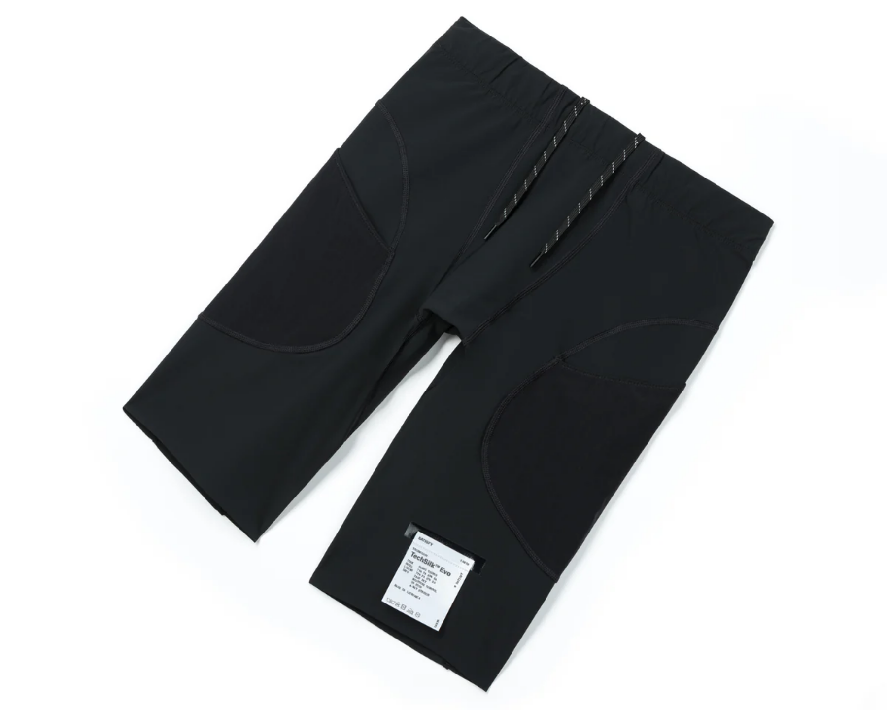 TechSilk™ is the Satisfy short that made the brand. A silk-hand nylon-Elastane shell woven in France, paired with a Justice™ Coldblack® liner that reflects heat even in black. 130 grams in the 8", a Cordura-reinforced version for trail abuse, an Evo version cut into cargo tights. Worn by Satisfy runners at races, recovery days, and in every Paris café from Belleville to Pigalle. Silk drape, technical guts, no compromise on either. The TechSilk™ Evo 9" Half Tights bring the silk-hand platform to the half-tight format — cargo-mapped pockets, 4-way stretch, Coldblack-liner DNA.