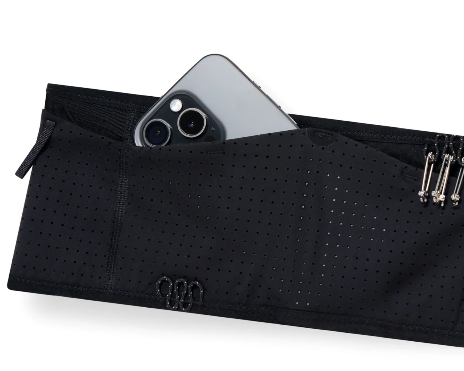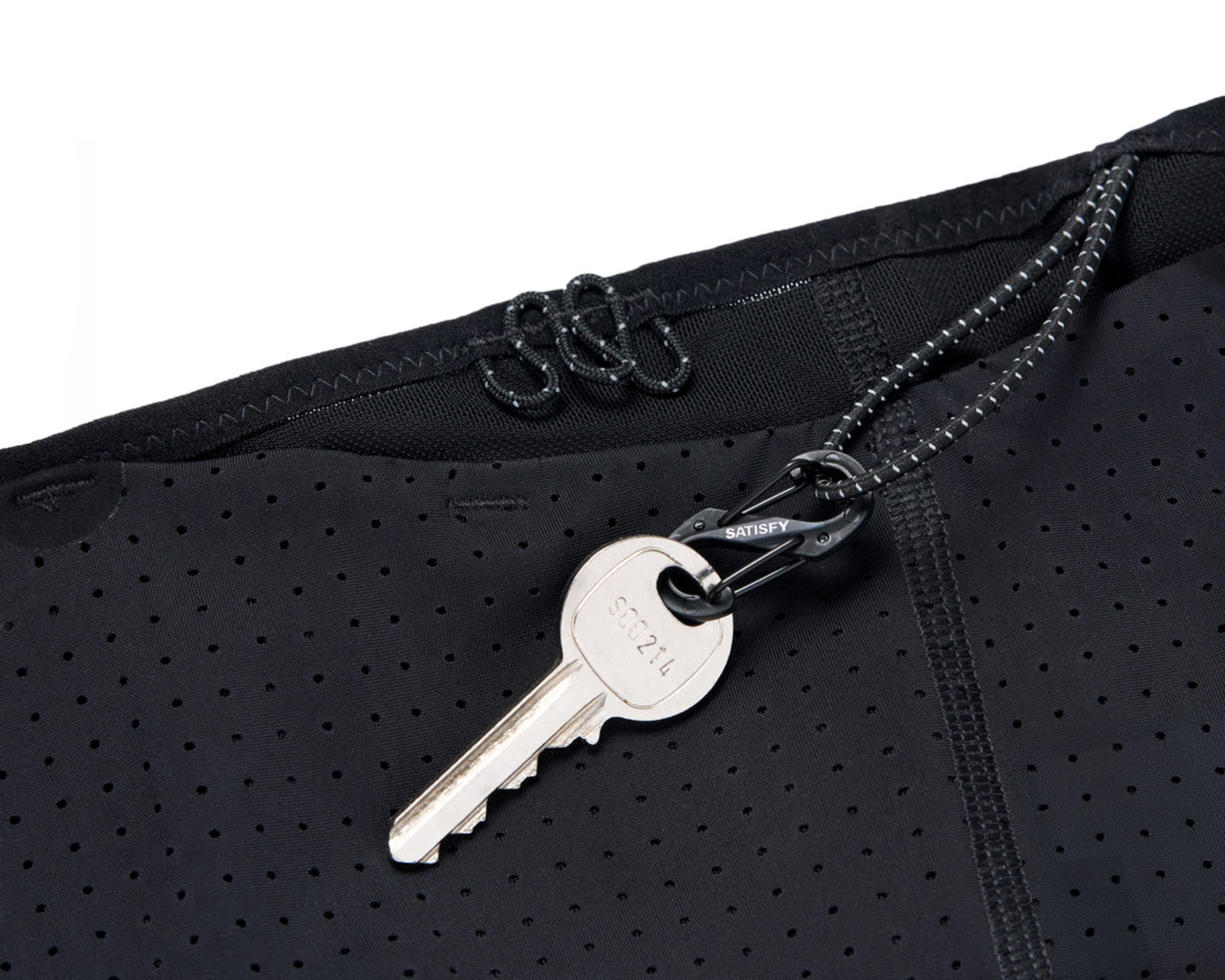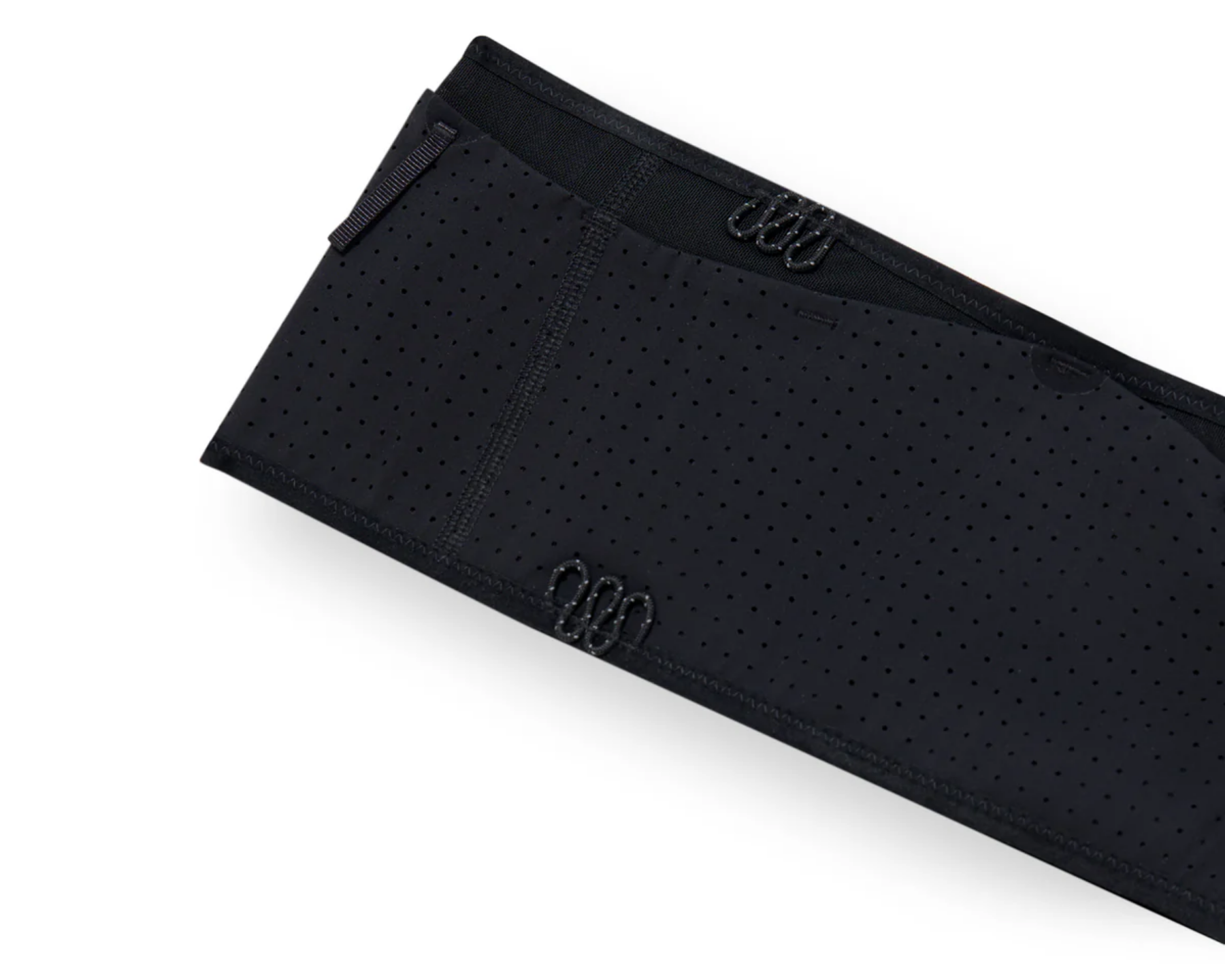 Space-O™ is Satisfy's race-day material — a perforated micro-jersey laser-punched with thousands of tiny holes (they call it punch-out). Seventy-five grams on the Singlet, four S-Pins sewn in for your bib, a bonded-seam construction so nothing scratches at mile 20. Engineered cool-to-touch, stretched to follow every stride. This is what you wear when the weather is cruel and the High is non-negotiable. The Space-O™ Belt carries essentials in the Space-O ecosystem — a race-weight wrap for keys, gels and a phone that doesn't bounce.